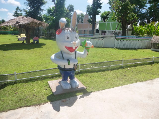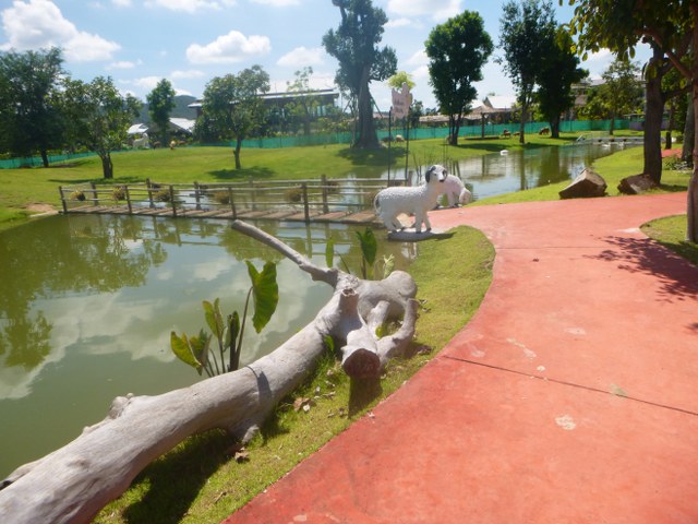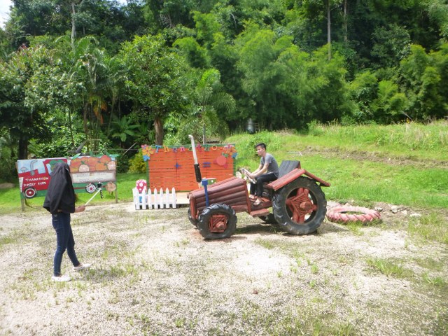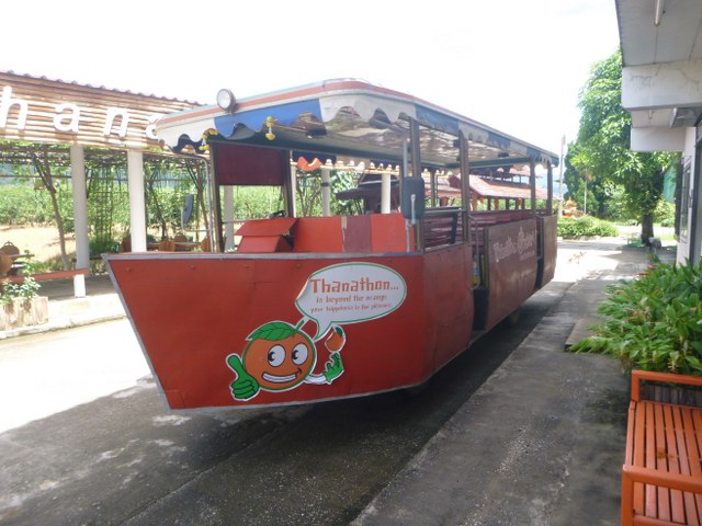 Entrée is 40 Baht. En dat is inclusief een rondrit, eigenlijk rondvaart want het voertuig is vermomd als boot, over het terrein.